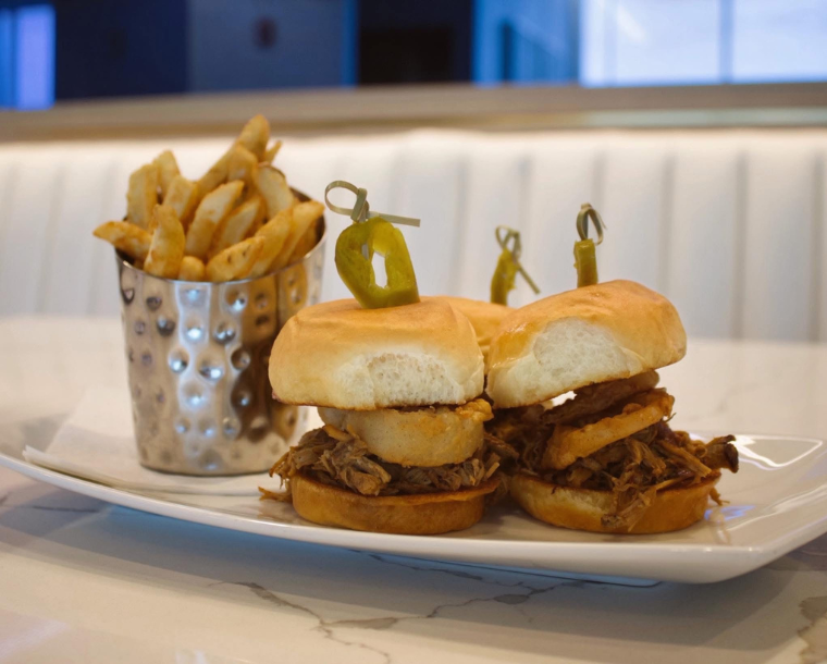 Three smoked pulled pork sliders, Altitude barbecue sauce, and onion strings on Hawaiian buns served with fries.