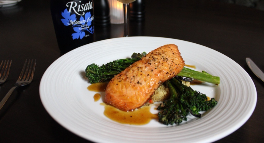 Enjoy this savory salmon, served with bourbon-style soy glaze, Asian-inspired cous cous, & grilled broccolini.