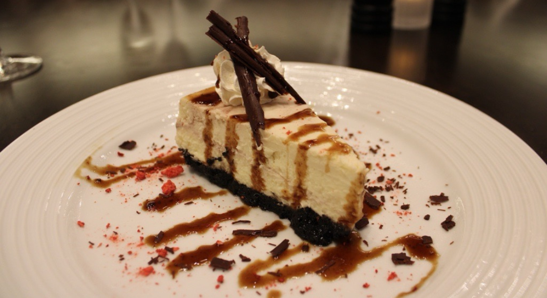 Indulge in this decadent dessert, with dark chocolate crust, strawberry-balsamic reduction, whipped cream, & chocolate curls.